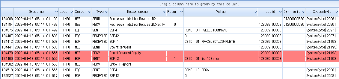 - Grid의 SystemByte 항목 값이 동일한 메시지들의 CarrierID 항목을 점검합니다.