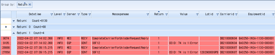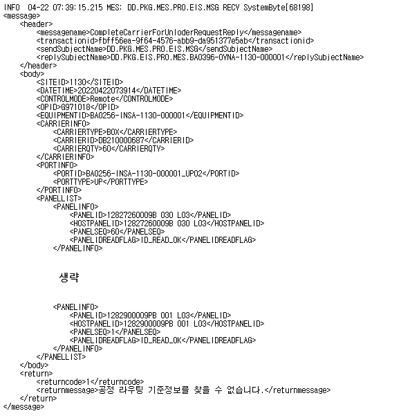 오류가 발생한 메시지명과 오류내용(returnmessage)