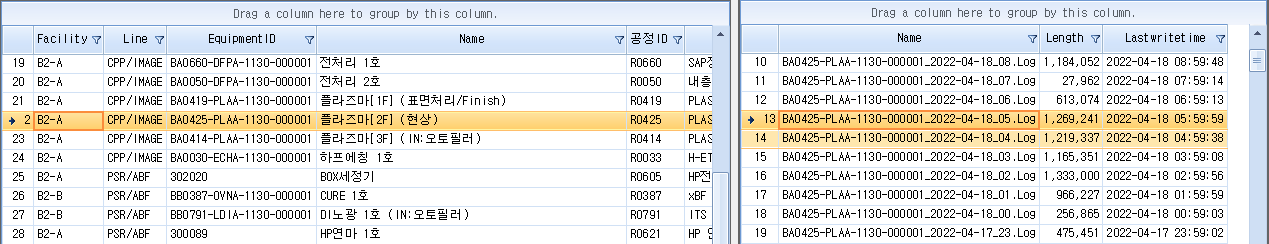 - 설비 Grid에서 설비정보를 Double-Click 하면, 해당 설비의 최근 로그파일 1개를 로그뷰어에 출력합니다.
